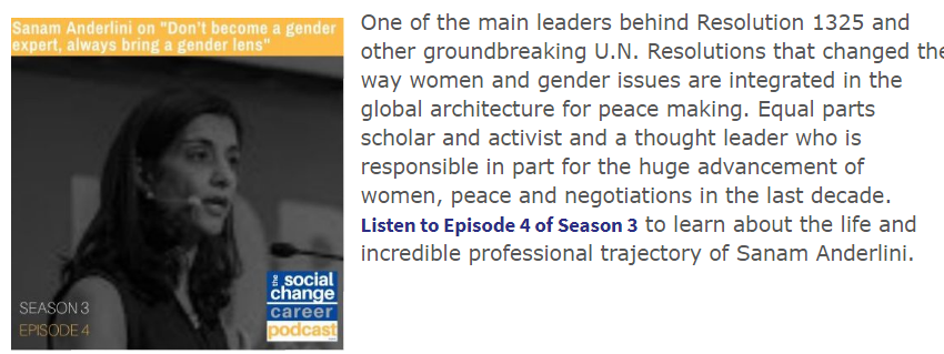 PCDN’s podcast series The Social Change Career featured ICAN’s ED Ms. Sanam Naraghi Anderlini in its fourth episode of the third season. Among other things, Ms. Anderlini spoke about what inspired her to pursue a career in conflict resolution, and specifically work on women and peacemaking.