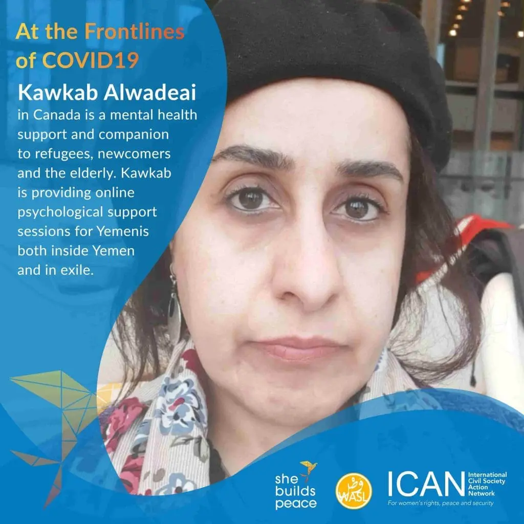 WASL partner Kawkab Alwadeai is working online with Yemenis to help conflict survivors overcome mental challenges such as PTSD and depression. In Canada she supports refugees and spends time with elderly people, many of whom are alone in isolation during COVID 19.