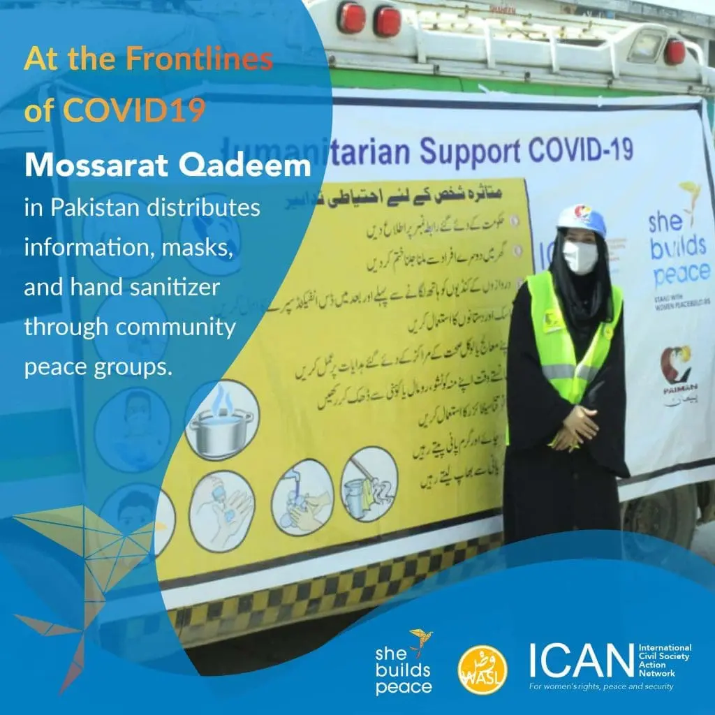 WASL partner Mossarat Qadeem is helping raise awareness and distribute homemade masks, hand sanitizer and disinfectant spray – all made by Qadeem’s organization PAIMAN—to communities in rural areas with the help of TOLANAs, or community peace groups.
