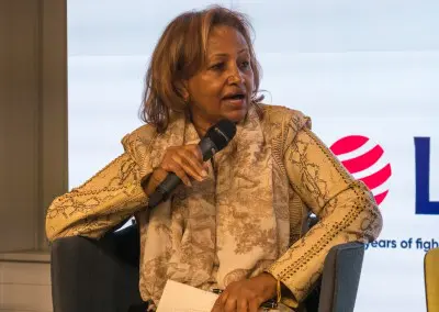 Following opening remarks by Norad’s Bård Vegar Solhjell, Sanam Naraghi Anderlini provided context for the high-level dialogue (access the transcript here). Naraghi Anderlini reminded the audience of the sobering realities of a world in which wars are starting, but not stopping. With 55 interstate wars, 86 conflicts involving nonstate actors, 614 million women and girls living in conflict-affected countries, and over 100 million war refugees, Naraghi Anderlini urged the audience to collectively pause and acknowledge the realities of a geopolitical tsunami of compounding crises. Interconnectivity is here to stay, she noted, and with it comes an imperative to embrace holistic, locally driven solutions that radically differ from the status quo.