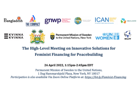 ICAN together with GPPAC, GNWP, Kvinna till Kvinna, Permanent Missions of Bangladesh, Ireland and Sweden to the United Nations, UN Women, WILPF and WPS-HA Compact cordially invite you to a high-level hybrid roundtable on Innovative Solutions for Feminist Financing for Peacebuilding, to take place on 26 April 2022 at 1:15-2:45pm EDT as part of discussions surrounding the High-Level Meeting on Financing for Peacebuilding.